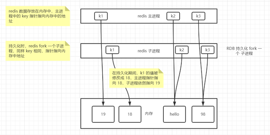 从图中我们可以清晰的看到,Redis 备份时,fork 了一个子进程,子进程去做持久化的工作,子进程中的 key 指向了 8 点那一刻的数据,后面 k1 的值修改了,redis 会在内存中创建一个新的值,然后主进程 k1 指针指向新的值,子进程 k1 指针依然指向 19,这样 Redis 持久化的就是 8 点那一刻的数据,不会发生变化。同时,从图中我们也可以看到,Redis 持久化时并不是将内存中数据全部拷贝一份进行备份。