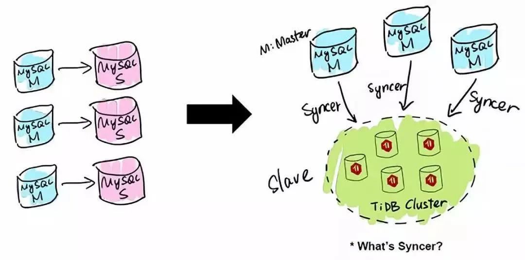 TiDB 应用的第一类场景是 MySQL 的分片与合并。对于已经在用 MySQL 的业务,分库、分表、分片、中间件是常用手段,随着分片的增多,跨分片查询是一大难题。TiDB 在业务层兼容 MySQL 的访问协议,PingCAP 做了一个数据同步的工具——Syncer,它可以把黄东旭 TiDB 作为一个 MySQL Slave,将 TiDB 作为现有数据库的从库接在主 MySQL 库的后方,在这一层将数据打通,可以直接进行复杂的跨库、跨表、跨业务的实时 SQL 查询。黄东旭提到,“过去的数据库都是一主多从,有了 TiDB 以后,可以反过来做到多主一从。”
