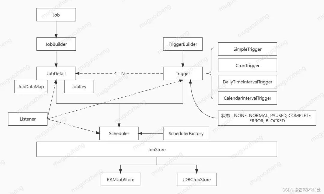 Trigger:触发器,定义定时任务的触发规则,包括执行间隔、时长等,使用TriggerBuilder创建,JobDetail和Trigger可以一对多,反之不可。触发器可以拥有多种状态。