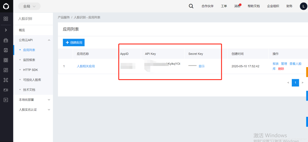 APP_ID 、API_KEY、SECRET_KEY三个参数分别为百度云人脸识别上面的三个数据项,如下图
