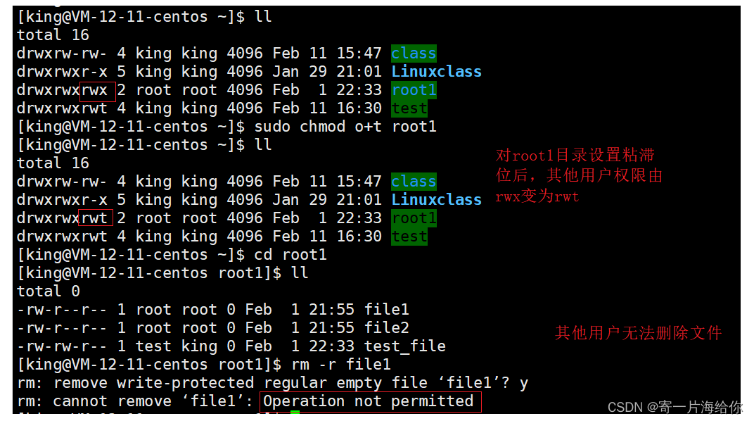 「4、在设置粘滞位的目录下,其他用户可以创建文件,但不能删除别人的文件」