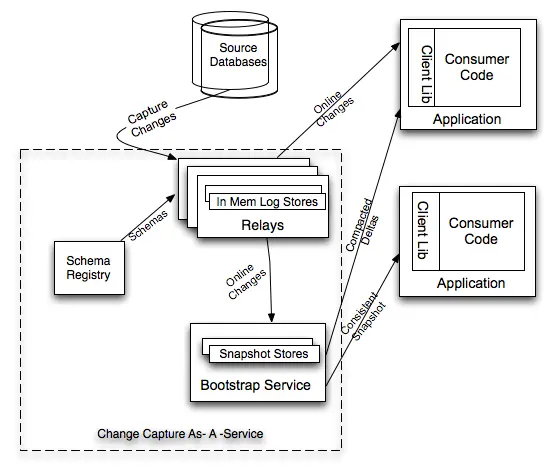 如果一个消费者的数据更新大幅落后,它要的数据就不在 Relay 的日志中,而是需要请求 Bootstrap 服务,返回的将会是自消费者上次处理变更之后的所有数据变更快照。