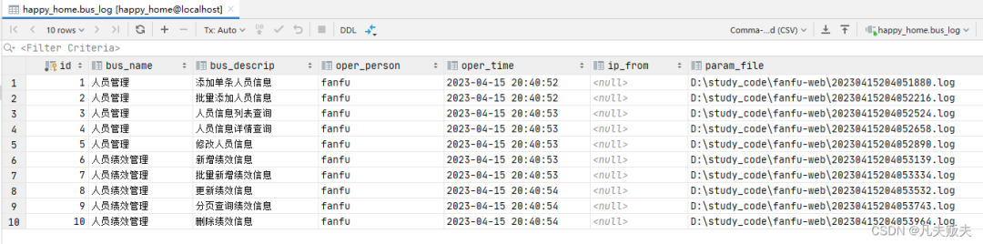 业务操作日志记录中包含了用户操作的功能名称、功能描述、操作人、操作时间和操作的参数报文,参数报文之所以选择存储在文件中,是因为正常情况下,是不需要知道具体的参数报文,只有在回滚操作的时候才会用到,可以根据上一次的参数报文逆向操作。