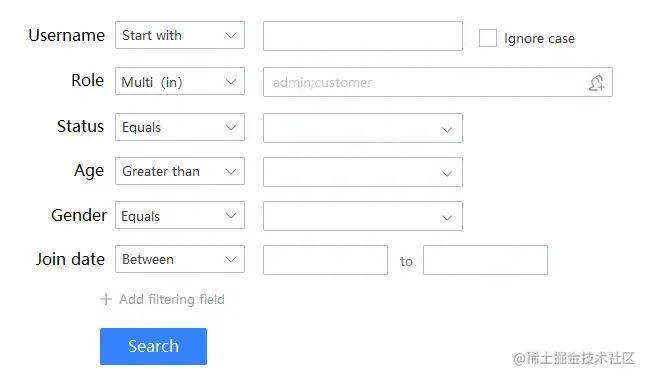 .field(User::getName).op(StartWith.class) // 修改 name 字段的运算符为 StartWith,参数值还是用前端传来的参数
