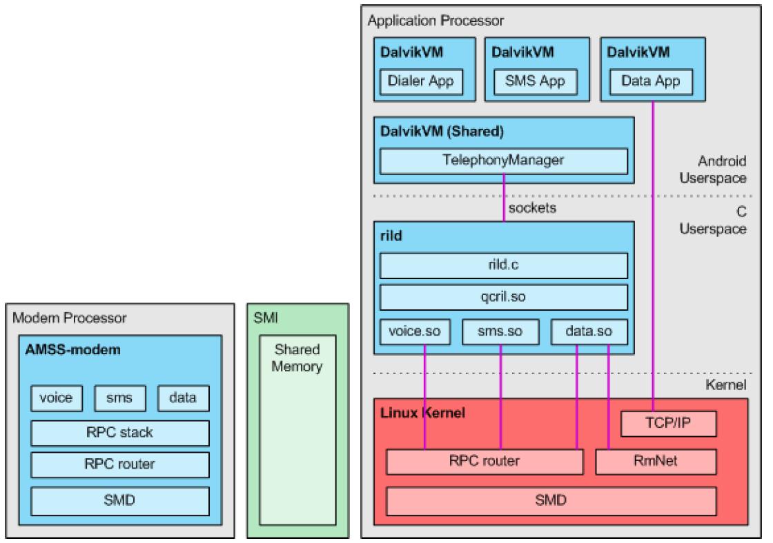 Android的RIL在这里被做成一个叫做rild的库,通过一个系统环境变量ro.radio.noril是否为空来决定要不要把RIL的代码编译进内核,这点跟CE的编译方式是一样的,如果设置了该变量,将会有个"SimulateCommand"的玩意编译进内核,它可以在没有实际GSM硬件的情况下模拟部分实际硬件的指令,然后让RIL驱动提供给上层应用,如果没有设置该系统环境变量就会采用RIL。 通过研究RIL的代码可以看到,Android的rild库是介于HAL接口与baseband modem之间,它同样提供了语音、数据、短信、SIM卡管理以及STK应用的功能,实现思路跟微软的RIL有异曲同工之妙,也是把标准的GSM27.007中常用的如dial这些做主动请求的操作称之为request,一共75个;另外一类GSM模块主动上报的例如信号强度、基站信息等,称之为unsolicited response,一共17个;开发模式也是跟微软RIL开发差不多,需要针对不同的GSM模块进行不同的GSM驱动开发,公用的部分google给你做好了,特定的部分需要你自己去定制,这样做可以大大地提高开发效率。 RIL跟上层通讯主要采用两种方式,一种是通过Socket发送与接收消息的方式来实现,这个Socket在ril.cpp里面可以找到它的创建代码: s_fdListen = android_get_control_socket(SOCKET_NAME_RIL); 还有另外一种方式就是直接通过TCP/IP直接访问内核中的shared memory,进行RPC调用,这种方式主要应用在数据模式上,一来由于Android的每个Activity随时都会有可能需要网络连接接收发送数据,因此必须提供一种实时性较高访问的方式,二来可以提高通讯效率。 其实最上层的ITelephony和SmsManager有点像WM里面的Connection Manager,呵呵,有意思,这是不是其实印证了一句话“万变不离其宗”呢?今天从大体的结构上讨论了一下Android RIL的大体架构,改天再仔细研究一下这个Android RIL的更细致入微的东西。如果大家有什么更有意思的发现,欢迎来信和我交流"gzuroy#gmail.com"(把#改成@)
