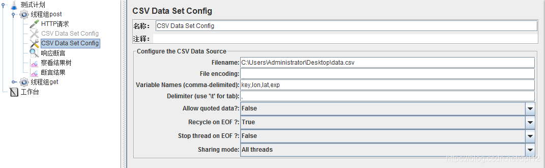 2、在Jmeter中关联txt文件(线程组->添加->配置文件->CSV Data Set Config)