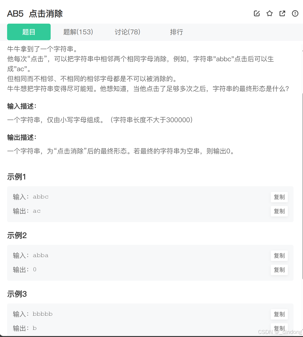 因为需要消除相邻的相等元素,删除完一次可能又会使两个相同的元素相邻,消除相邻的元素就可以利用栈的思路,创建一个字符串ret模拟栈的行为,如果ret是空的或者ret的末尾不等于遍历到的元素,加入字符串,否则就pop_back