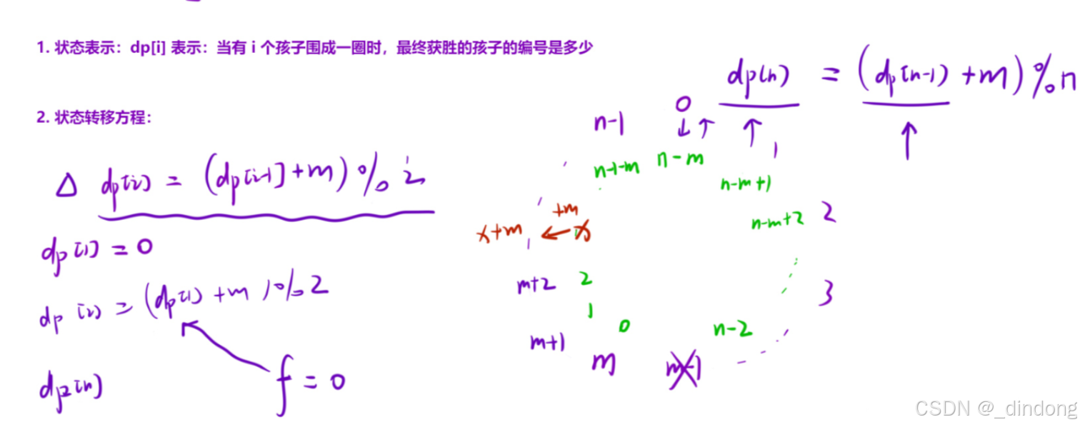 dp[n]从0开始数,数到m-1,删掉这个位置,原本下标为m的位置从0开始,映射到n-1里面就是n里边的下标全部减去m,那么n-1映射到n就是下标加上m然后取模于n
