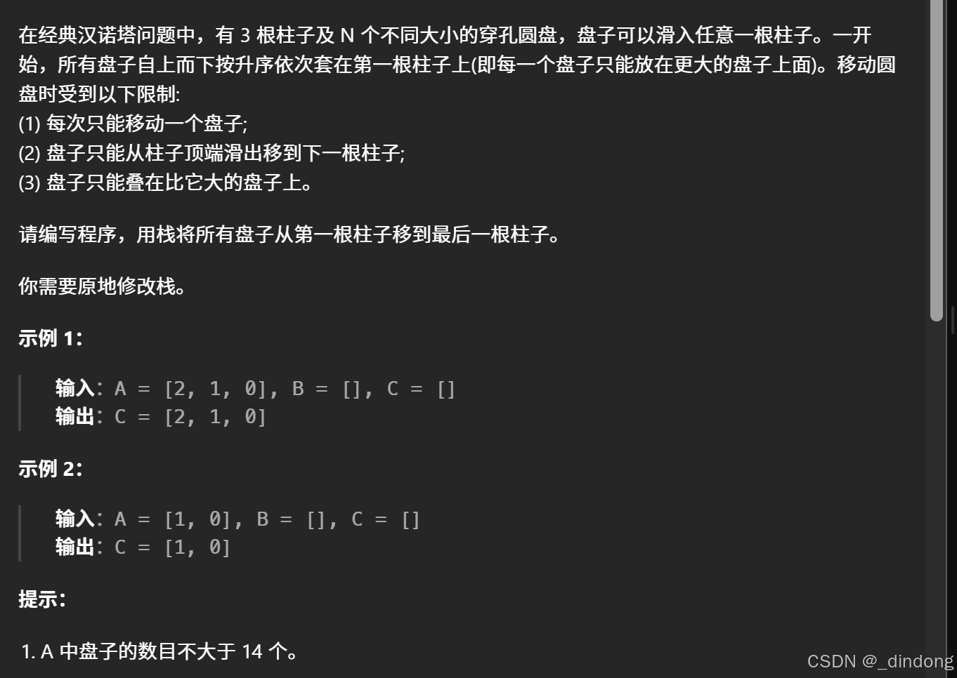 void hanota(vector<int>& A, vector<int>& B, vector<int>& C) {