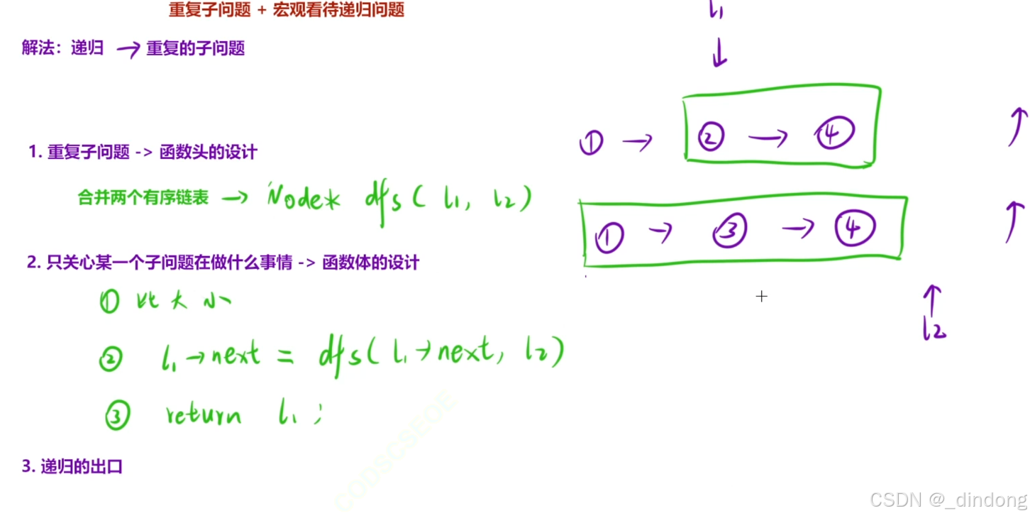 递归的本质就是所有的问题都能转化为一个小问题,这里的小问题就是比大小,小的让它next拼接上后面剩余所有合并的结果就解决了,递归终止条件是看谁先没,就return剩下的那些。
