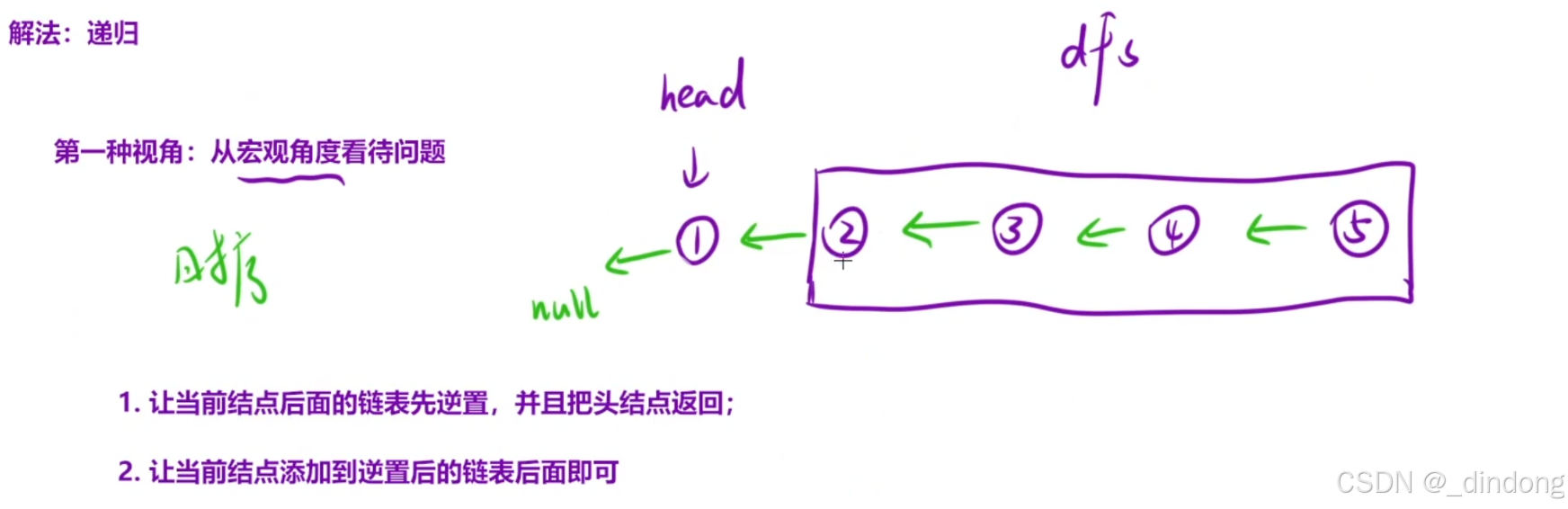 对于每层调用:让当前结点next的next指向当前结点,然后当前结点next指向空,每层调用存一个末尾结点当newhead返回
