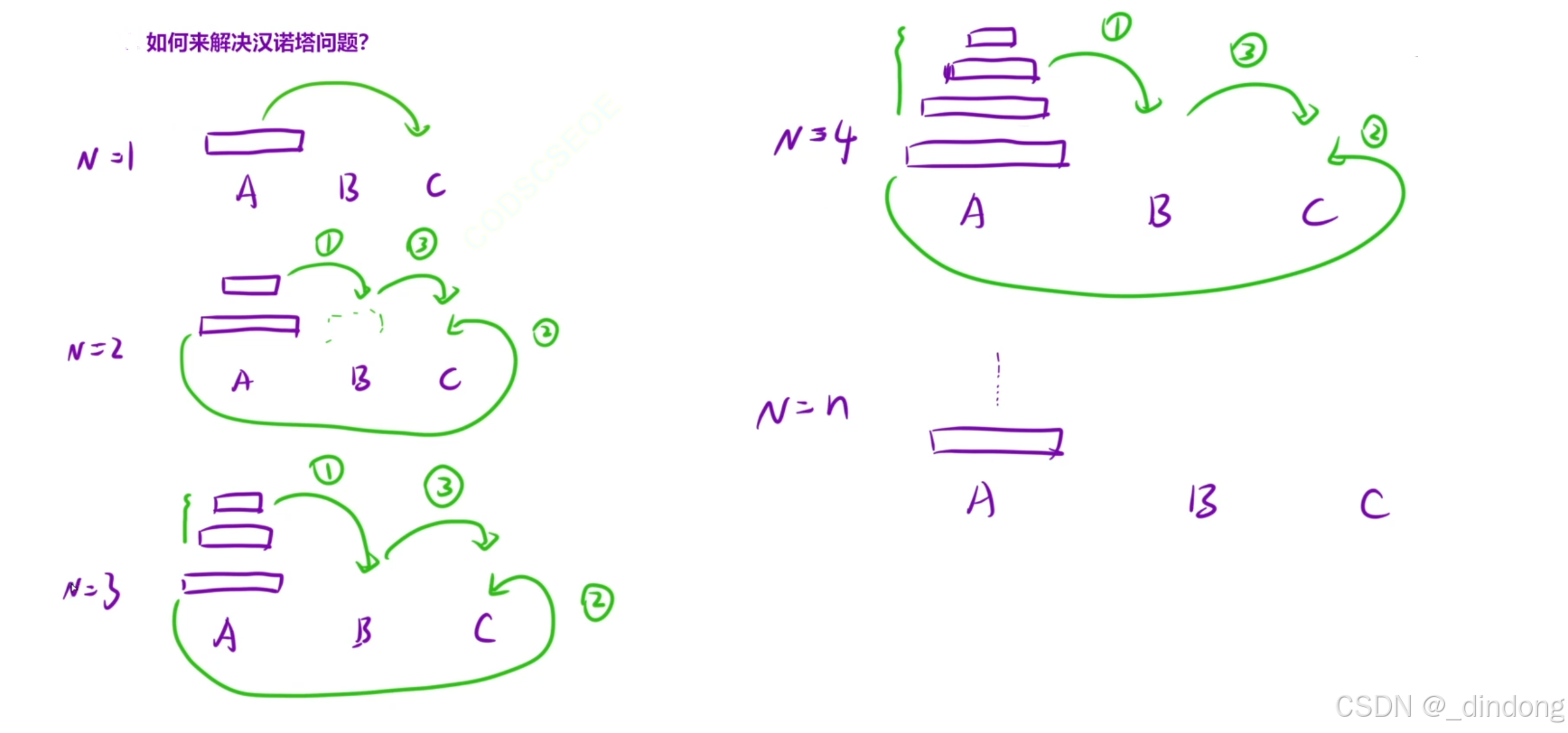 N=3,要把最大的先弄到C,就得先把剩下的上面的弄到B,相当于N=2的情况,此时C是辅助柱子,B是目标柱子