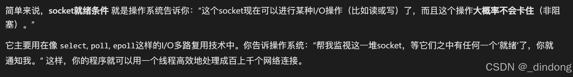 这样,I/O 多路复用结合非阻塞 I/O,既保持了非阻塞的高效(线程不阻塞在单个 I/O 上),又避免了盲目轮询对 CPU 的浪费。 应用程序只在有“真正工作”可做时才被唤醒。