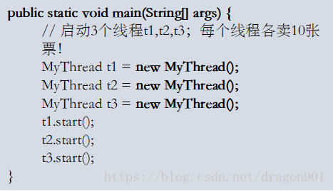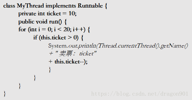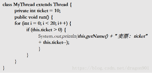 MyThread继承于Thread,它是自定义个线程。每个MyThread都会卖出10张票。