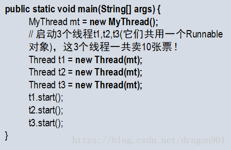 主线程main创建并启动3个子线程,而且这3个子线程都是基于“mt这个Runnable对象”而创建的。运行结果是这3个子线程一共卖出了10张票。这说明它们是共享了MyThread接口的。