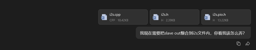 我对DS生成的代码肯定是保有疑虑的,于是一行一行的检查,碰到不太明白的地方让DS解释,我分析完,发现这次它照着模板生成的代码的质量挺高的,居然可以基本上不修改,直接使用。于是我把这些代码整合进i2s.h和i2s.cpp文件内。一次性顺利的编译通过。