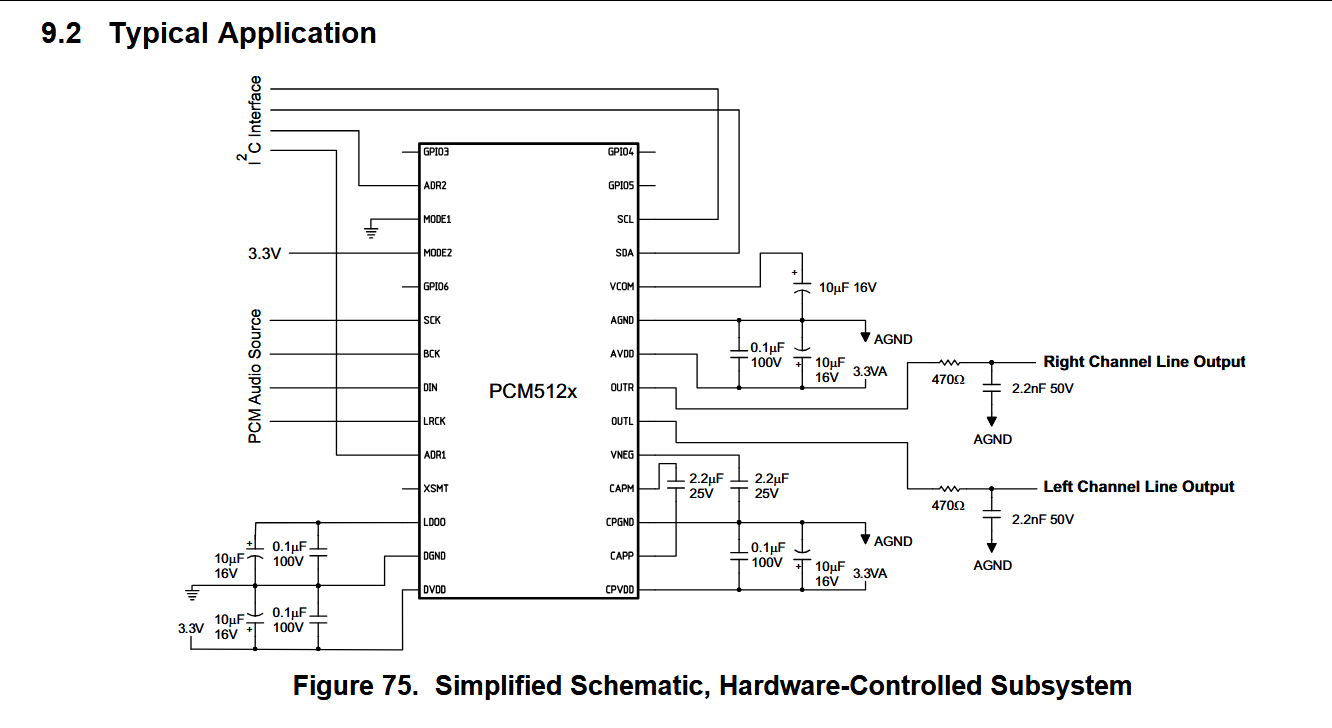 根据TI官方文档(图75)的建议,我们在PCM5122的单端输出端与地之间,接入一个RC滤波网络,其中电容的推荐值典型为2.2nF。