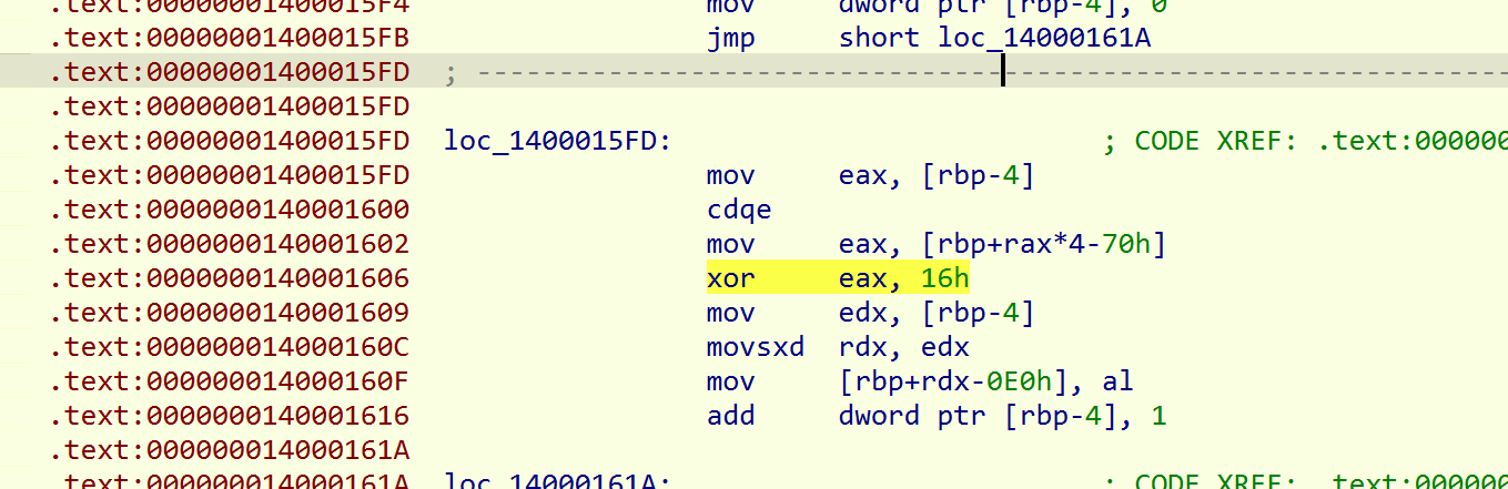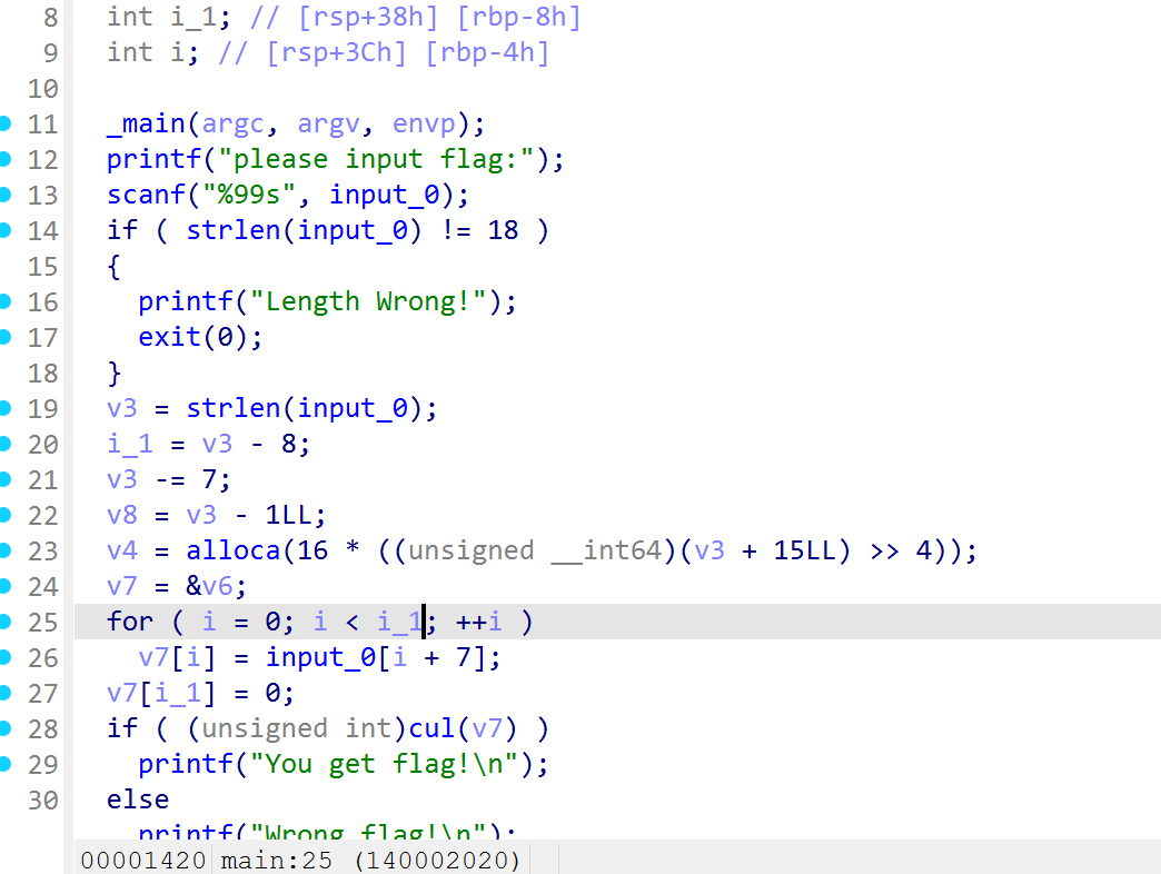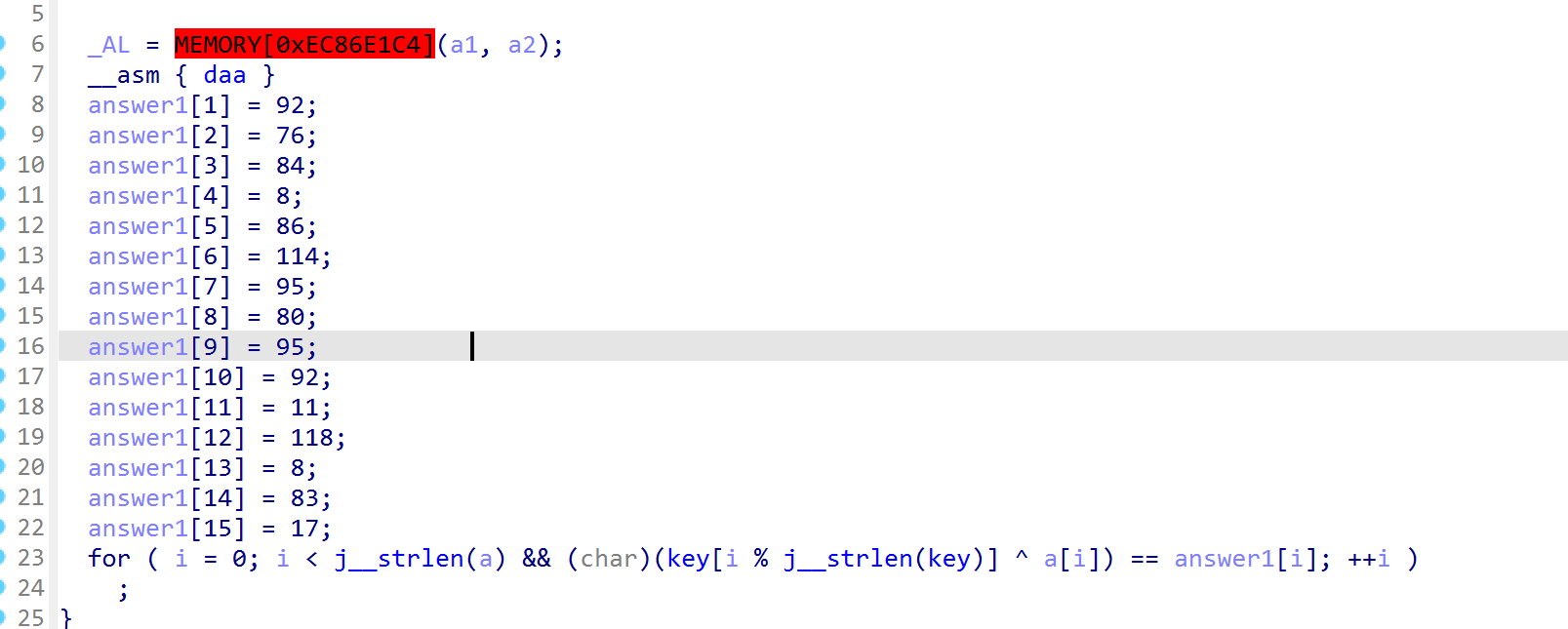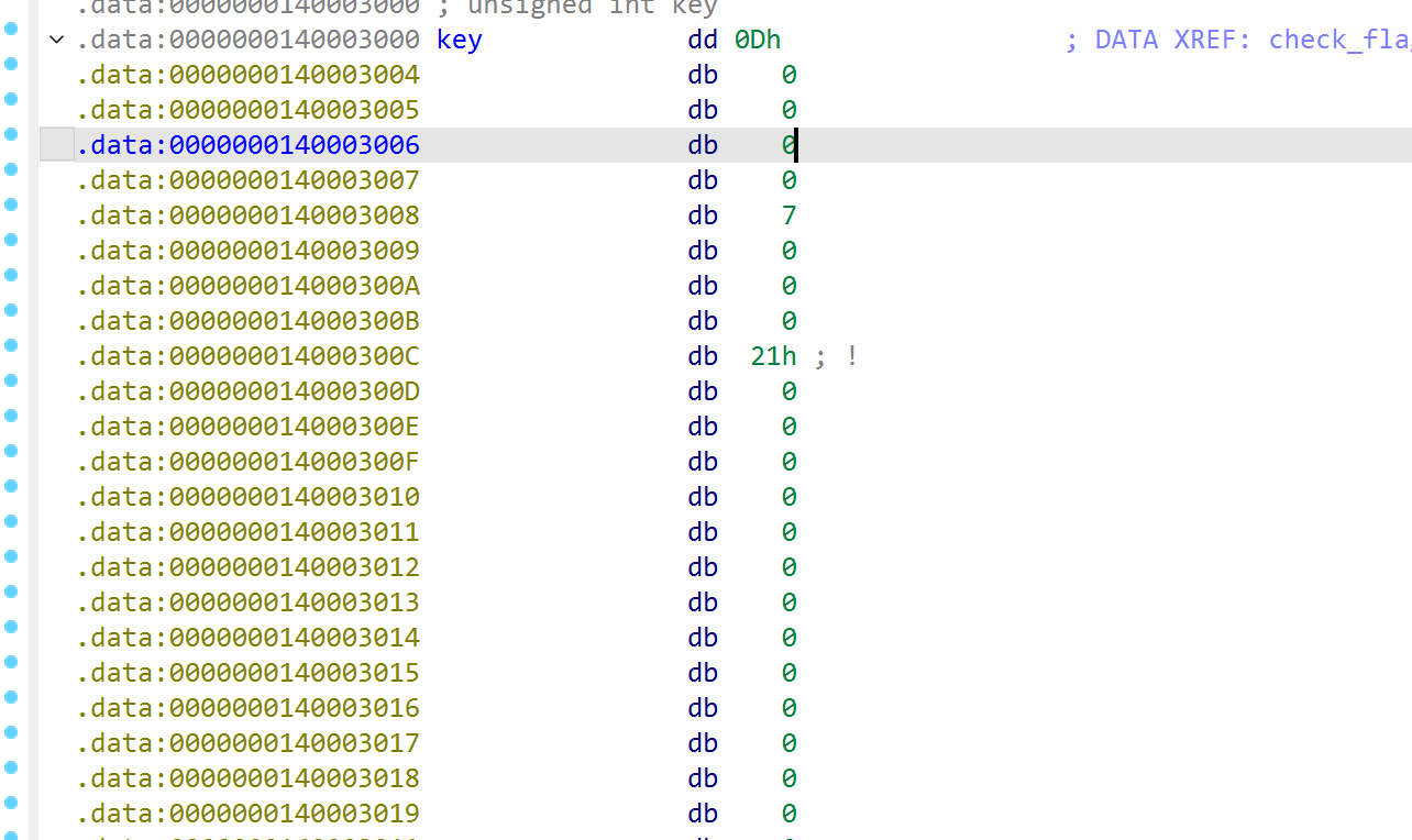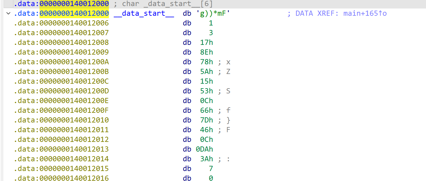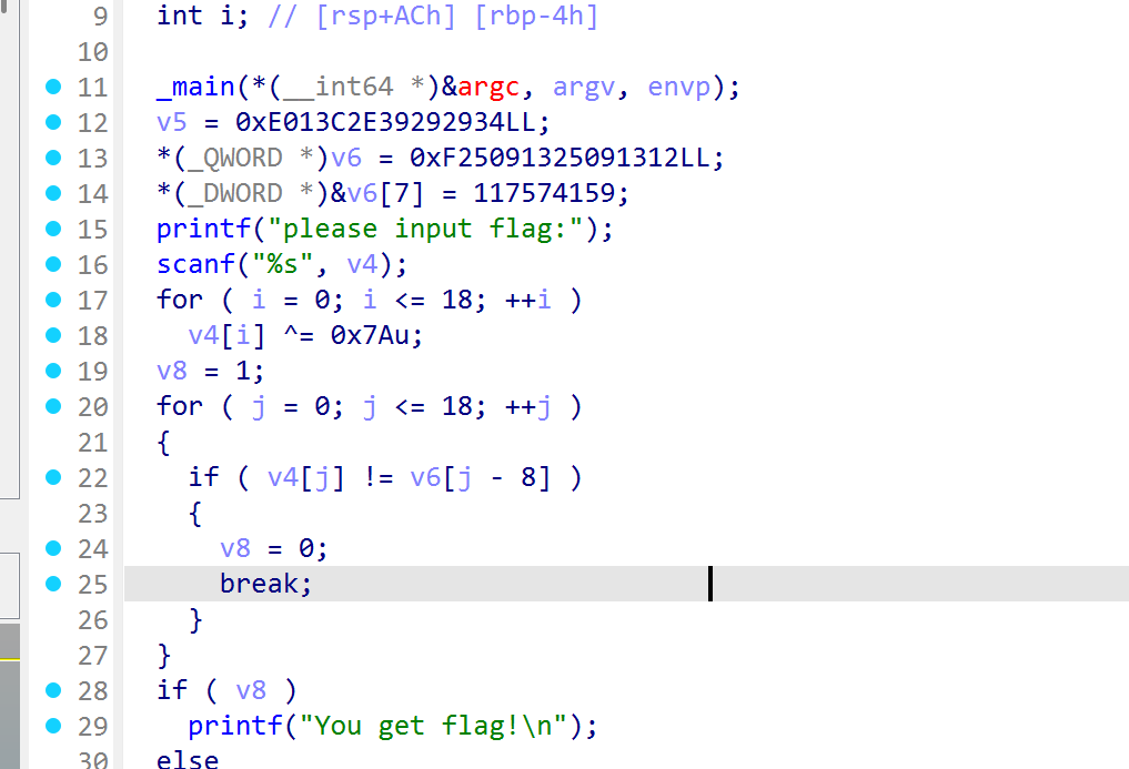 查看反编译,主要是异或之后和v6进行比较,看栈的话发现v5和v6相邻,那么v6读取为负数的时候会读取到v5,将v5和v6的值按小端序拆成一共20个字节,因为v6后面添加的部分会把v6最后一个字节给覆盖掉,所以一开始的只取7个字节,这样就是完整的19字节