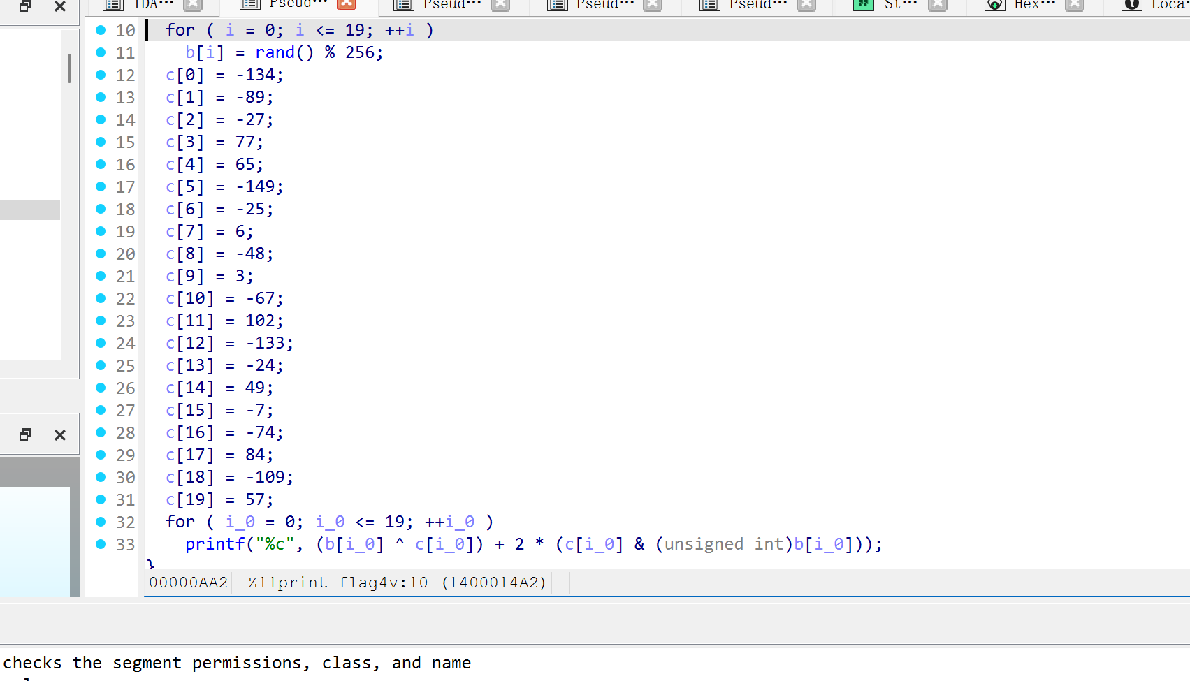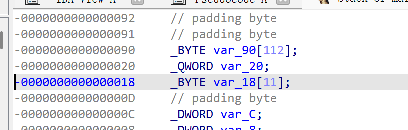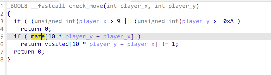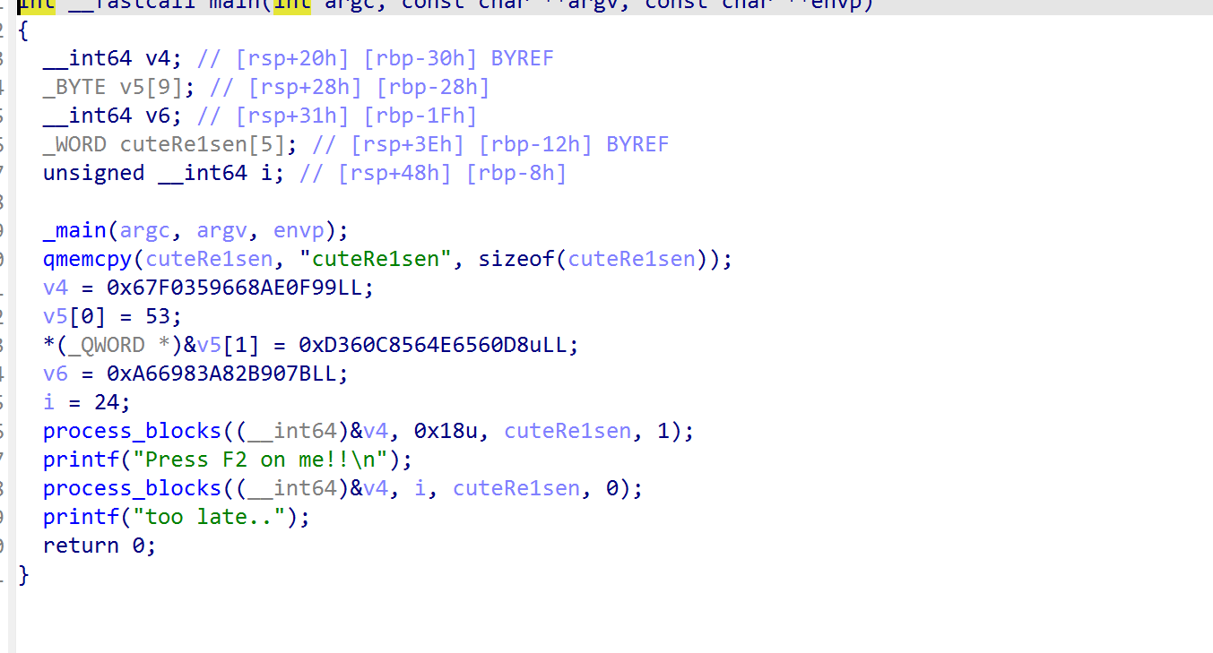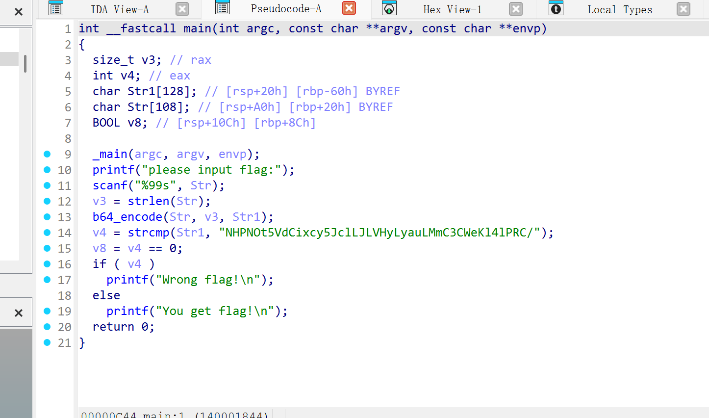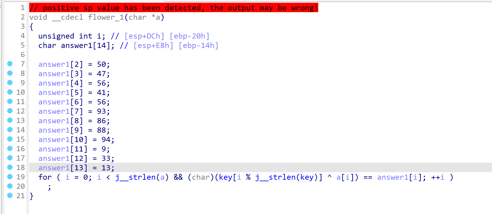 查看反编译,主要是异或之后和v6进行比较,看栈的话发现v5和v6相邻,那么v6读取为负数的时候会读取到v5,将v5和v6的值按小端序拆成一共20个字节,因为v6后面添加的部分会把v6最后一个字节给覆盖掉,所以一开始的只取7个字节,这样就是完整的19字节