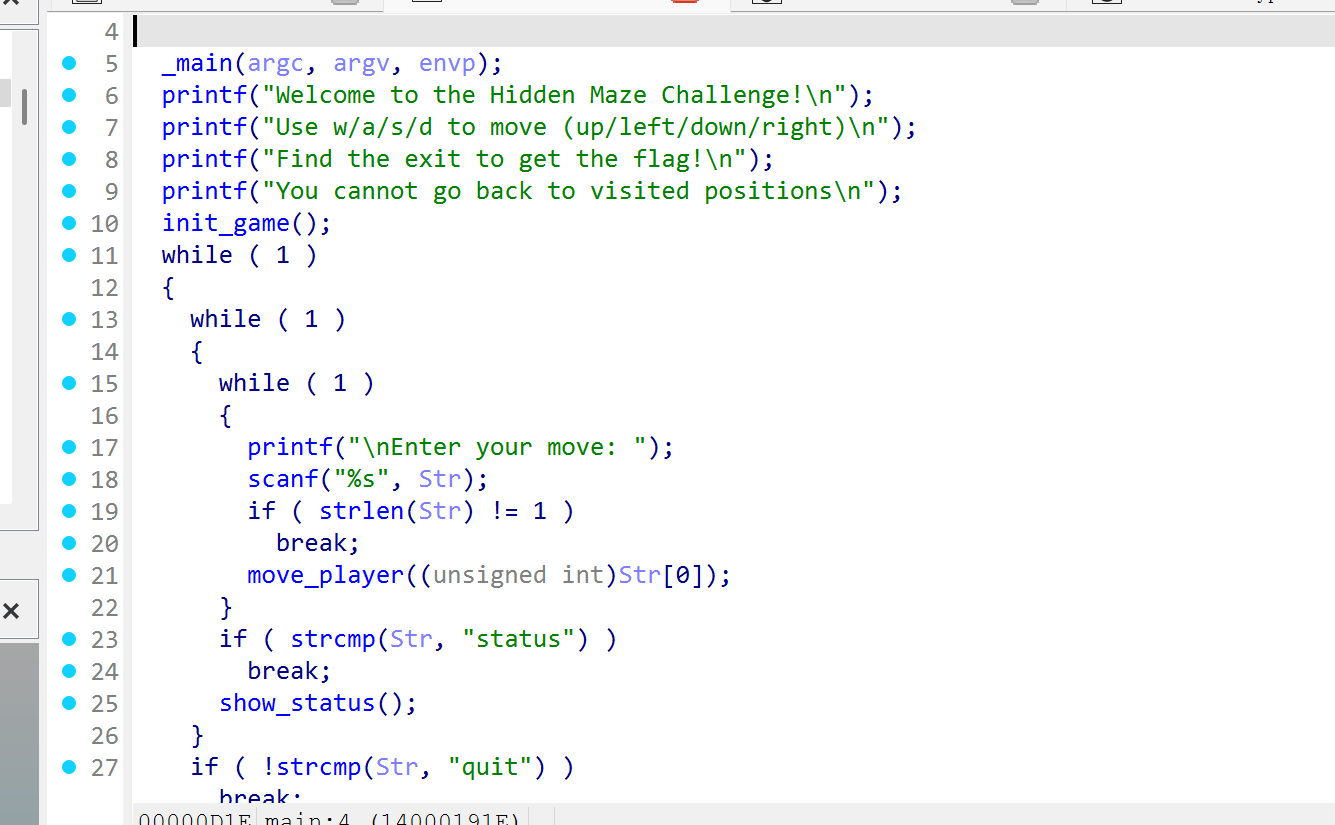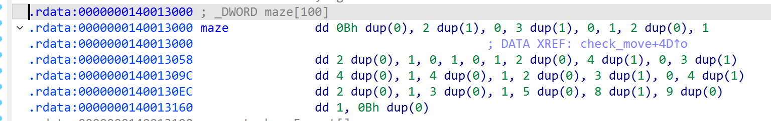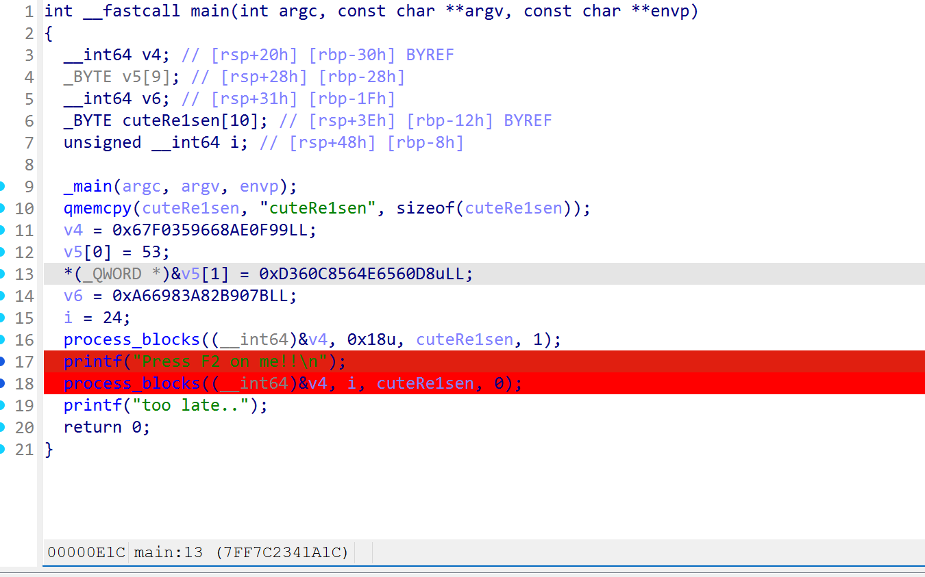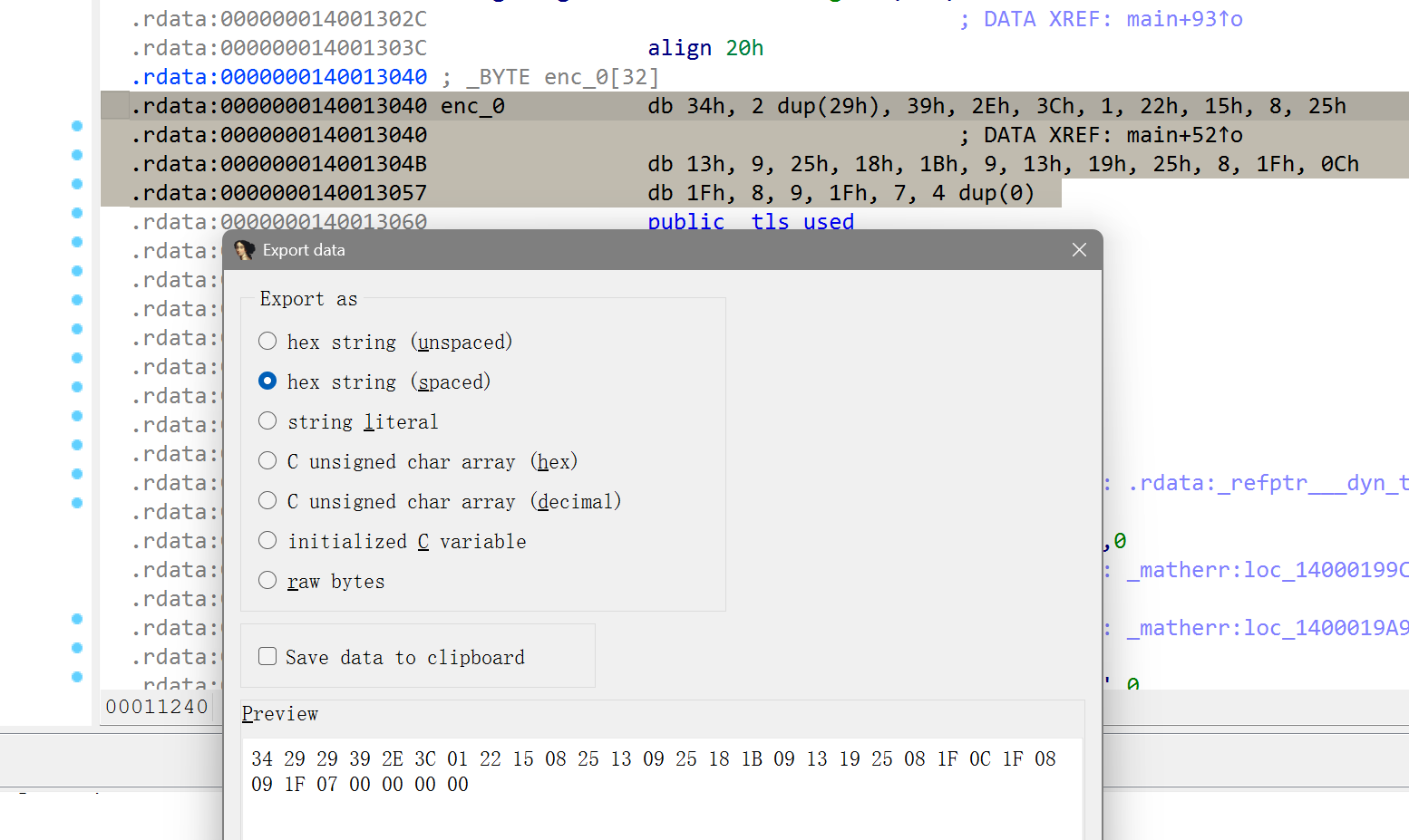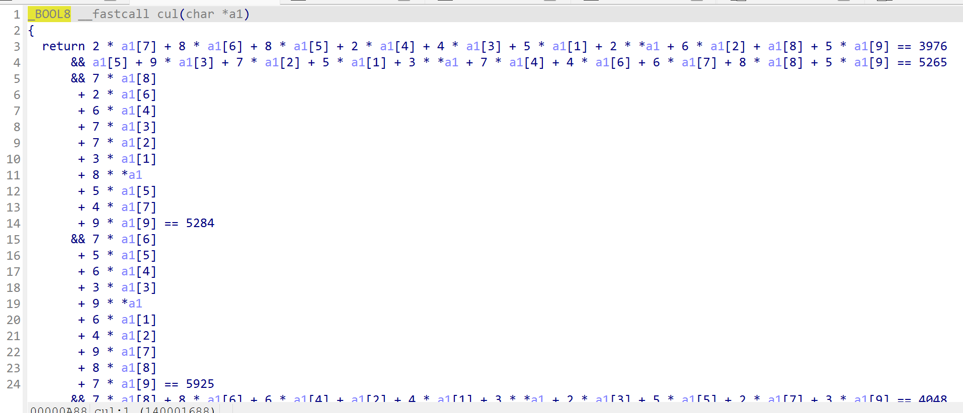 查看反编译,主要是异或之后和v6进行比较,看栈的话发现v5和v6相邻,那么v6读取为负数的时候会读取到v5,将v5和v6的值按小端序拆成一共20个字节,因为v6后面添加的部分会把v6最后一个字节给覆盖掉,所以一开始的只取7个字节,这样就是完整的19字节