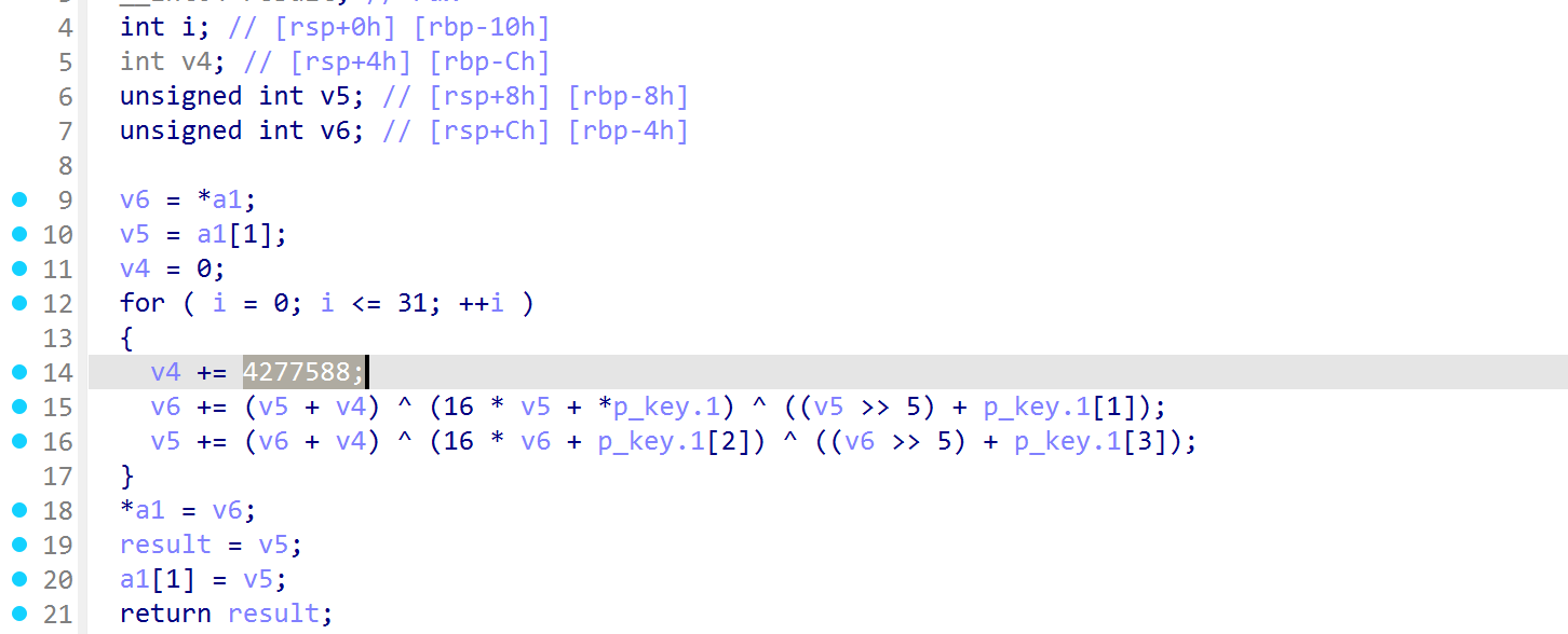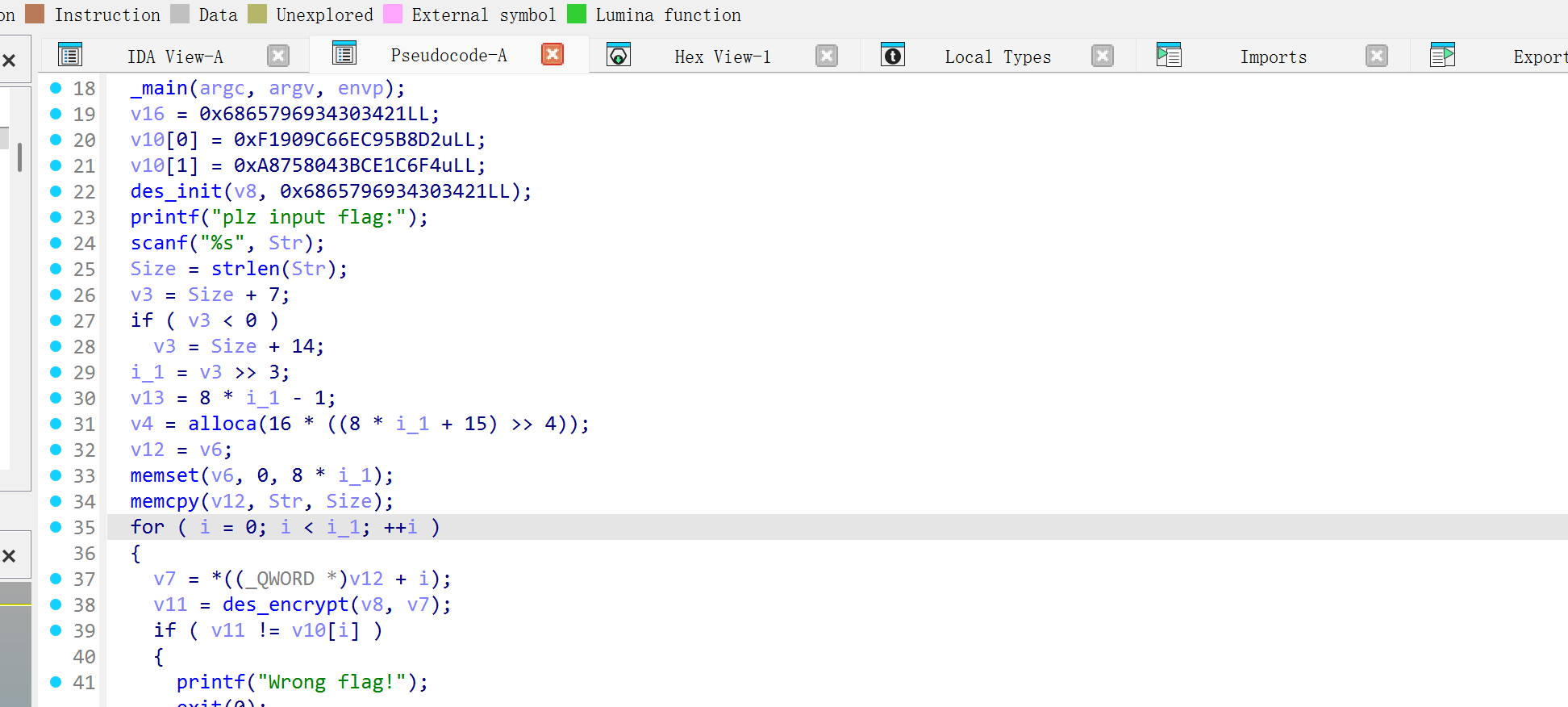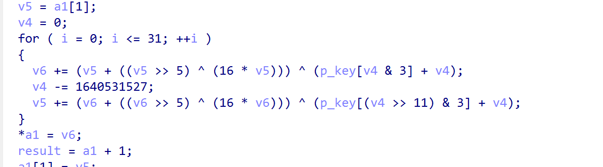 这里分析代码逻辑,标准的des,就是将明文拆成两部分去进行对比,进行分开解密,v10为密文,v8为密匙
