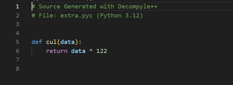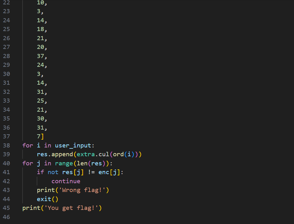 enc_flag = bytes([0x1a, 0x7, 0x17, 0x16, 0x13, 0x3a, 0x39, 0x15, 0x1d, 0x2d, 0x35, 0x1d, 0x13, 0x3b, 0x10, 0x4,0x11, 0x9, 0xb, 0xc, 0xc, 0x2a, 0x4, 0xf, 0x1c, 0x28, 0x6, 0xc, 0x12, 0x8, 0x6, 0x7e, 0x7d])