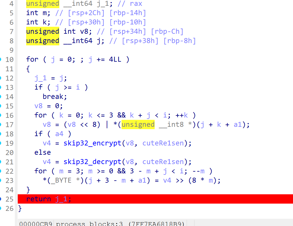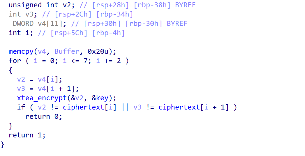 encrypted_block = xtea_encrypt_verify([plaintext_blocks[i], plaintext_blocks[i+1]], key)