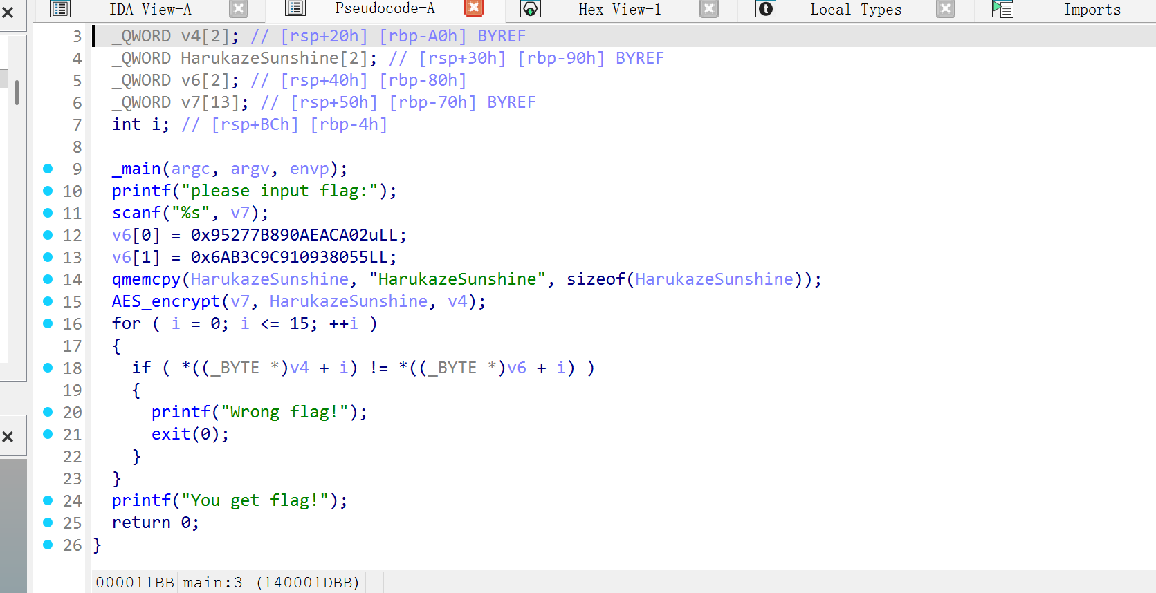 直接查看伪代码,标准的aes,找到密文v6和密匙,注意这里的密文是小端序,需要调整顺序