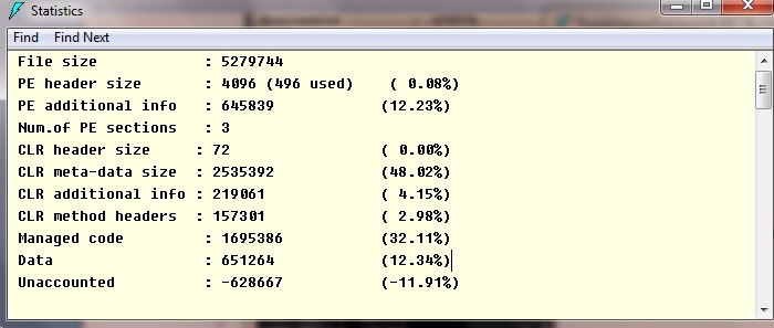 2. 我们再来随便找一个DLL,比如WPF的DLL:C:\Program Files\Reference Assemblies\Microsoft\Framework\v3.0\PresentationFramework.dll,同样适用ILDASM打开,点击:View->Statistics看一下其中的元数据大小:
