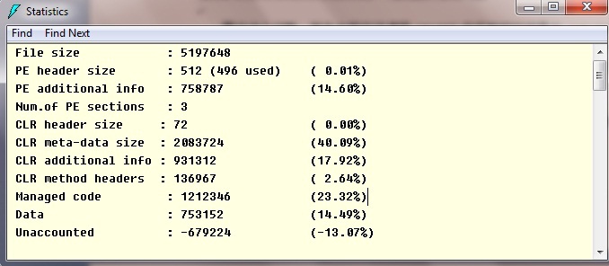 1. 用ILDASM工具将C:\Windows\Microsoft.NET\Framework\v4.0.30128 下面的MSCorlib.dll(.NET核心类库程序集,其他版本也可以,不必非要4.0)打开。点击:View->Statistics,看一下其中的元数据大小: