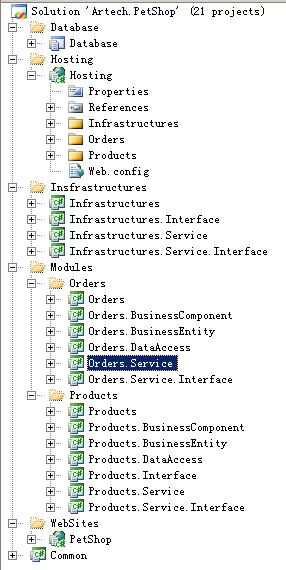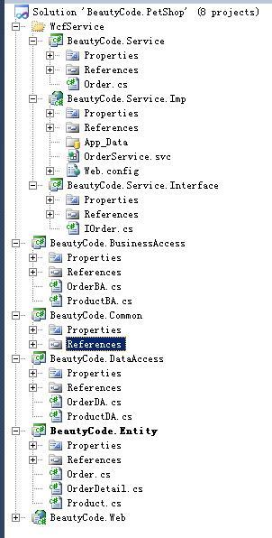 下面借用一下Artech 的WCF.PetShop项目的结构图,如有不妥,请来电说明,我会及时替换。感谢Artech 给大家带来的精彩分析,以及他无私的奉献。