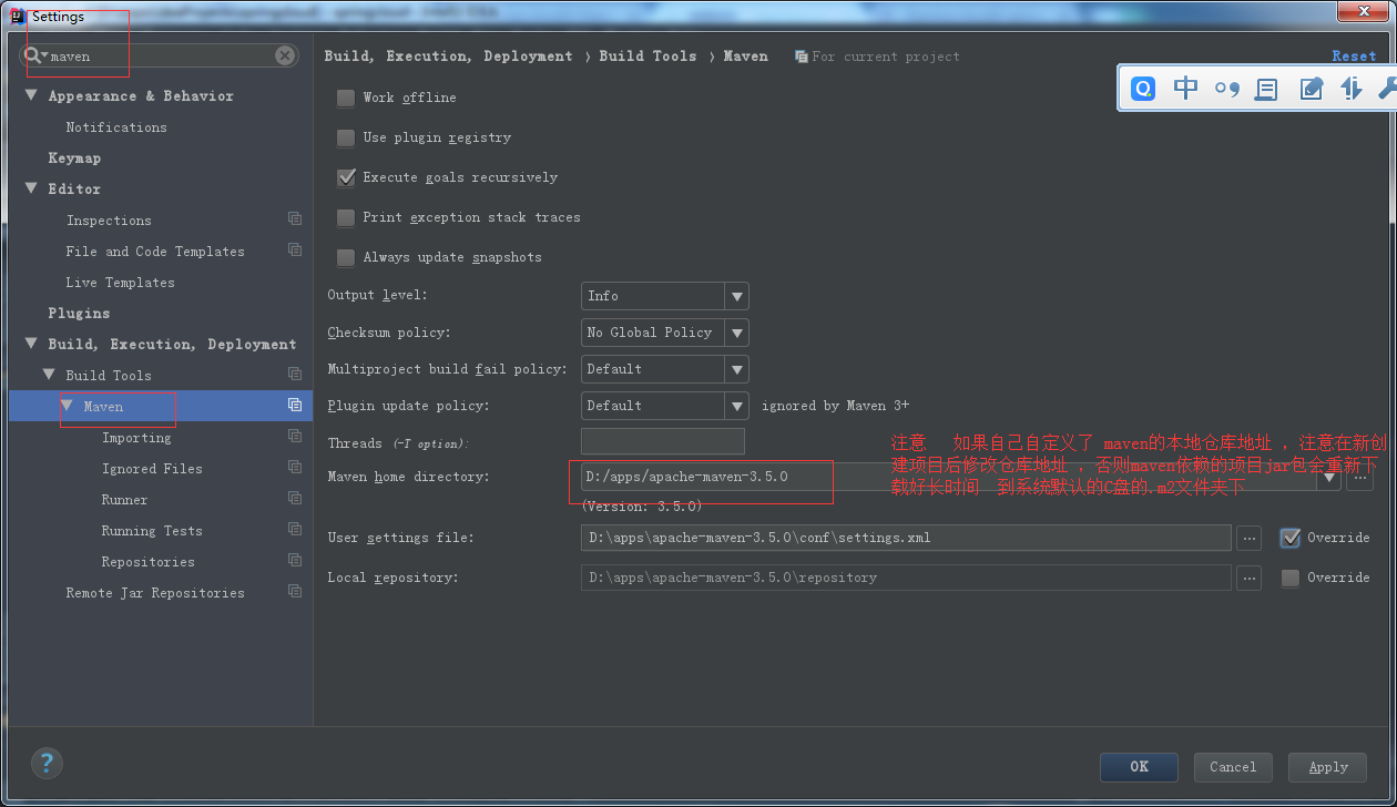 【如果使用的是maven的话】注意,新创建了新的项目以后,idea的关于maven仓库地址的设置,需要重新设置一下