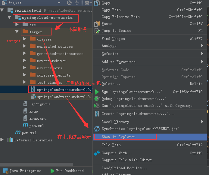 第三步打包成功的jar包,可以在本服务的target中找到【注意,target下所有东西都可以删除掉,因为target下所有文件都是编译以后的结果】