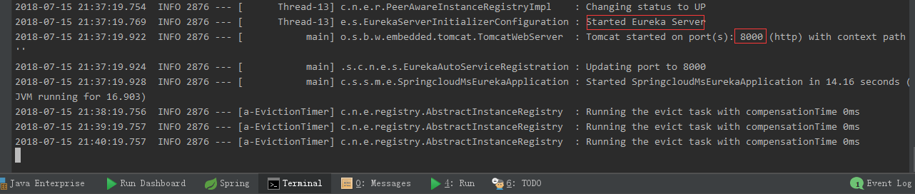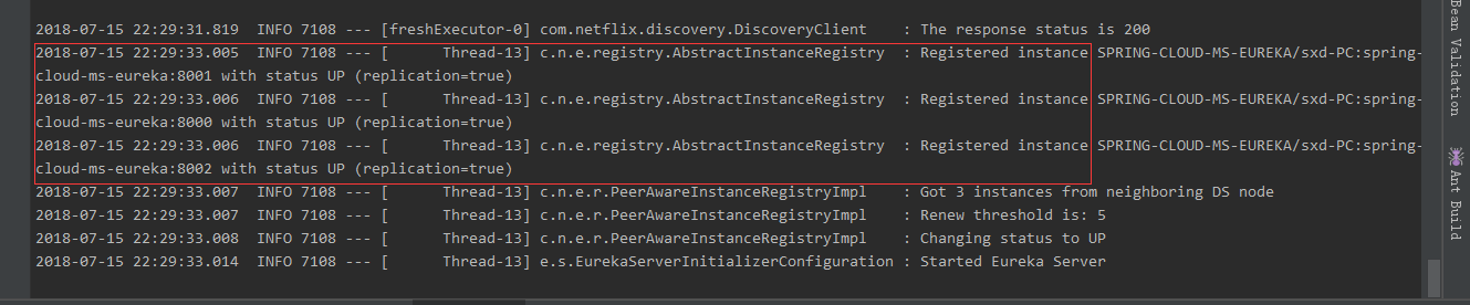 OK,正常启动完第一个服务。应该是会报错连接失败,因为它要注册的地址服务2和服务3都还没有正式启动,直到三个服务都成功启动了,才会都正常了。