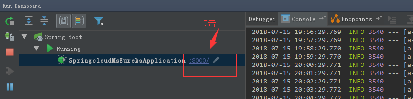 启动以后,按照刚刚eureka配置文件中配置的端口访问页面,或者在Run Dashboard中点击对应端口直接就在浏览器启动也可以