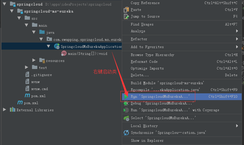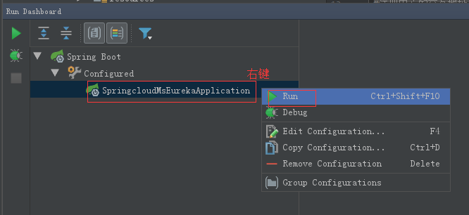 第四步》》》好了 最后启动服务,右键 启动 启动类或者在Run Dasboard右键启动