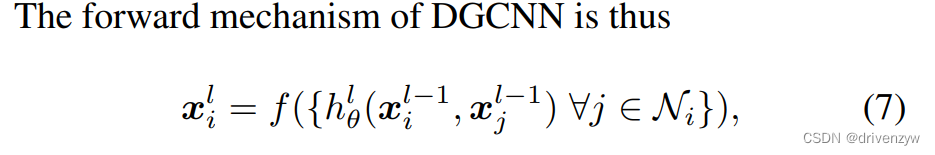 (1)DGCNN是基于PointNet的改进,PN提取点的特征的时候没有考虑邻域的点,但 DGCNN考虑了,文中的说明公式为: