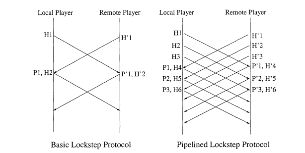 Pipelined Lockstep protocol基于Lockstep protocol,为了防止cheatahead外挂同样需要提前发送hash,这种操作同步、不等待超时玩家的确定性锁步的特性逐渐成为“Lockstep”的标准,被广泛应用于网络同步中。