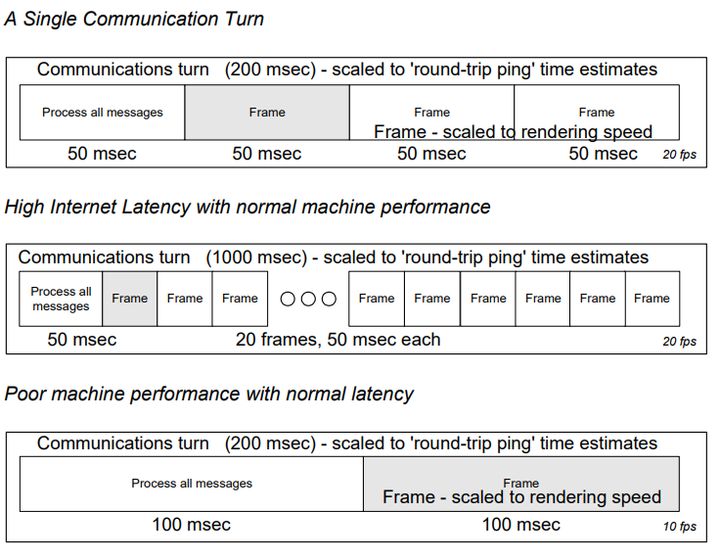 此外,为了避免高性能机器受低性能机器的影响而变“卡”,“帝国时代”里面每一步(称为一个turn)的长度是可以调整的,并且完全与渲染分开处理。每个客户端会根据自身的机器性能与网络延迟情况来动态调整步长时间,如果性能优良但是延迟高就会拉长每个turn的时间(多出的时间用于正常进行多个帧的渲染以及Gameplay的处理,虽然可能有误差),如果性能差但是网络正常就会把大部分的时间用于每个turn的渲染,在这种条件下每个客户端相同的turn执行的本地时间虽然不同,但是执行的内容是完全一致的。
