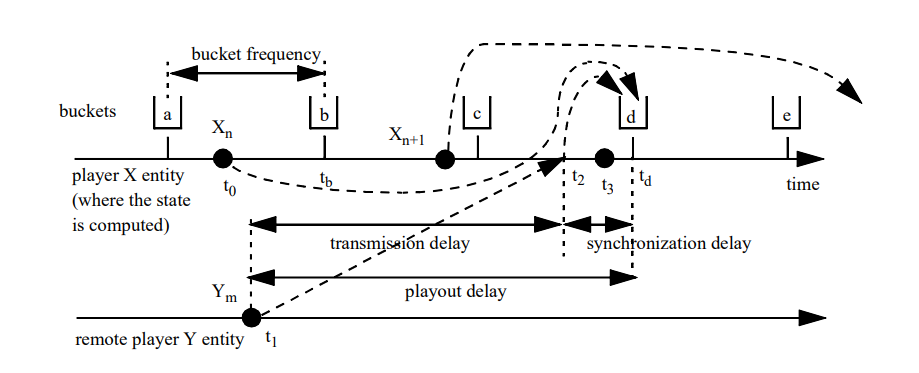 1999年,Christophe Diot和Laurent Gautier的团队开发了一款基于互联网的页游——MiMaze,基于传统的Time Bucket Synchronization[6]他们在发布的论文里面提出了改进后的Bucket Synchronization同步方法[7]。Bucket Synchronization把时间按固定时长划分为多个Bucket,所有的指令都在Bucket里面执行。考虑到网络延迟的情况,每个玩家在本地的命令不会立刻执行而是会推迟一个时延(该时延的长度约等于网络延迟),用来等待其他玩家的Bucket的到来。如果超过延迟没有到达,既可以选择放弃处理,也可以保存起来用于外插值(Extrapolation)或者使用前面的指令重新播放。在这种方式下,每个玩家不需要按照Lockstep的方式严格等待其他玩家的命令在处理,可以根据网络情况顺延到后面的bucket再执行。Bucket Synchronization可以认为是我们常说的“乐观帧锁定”算法。