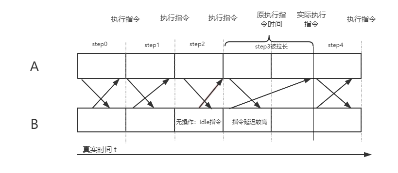 流水线操作是一种高效的数据传输模型,在计算机技术里面随处可见(比如计算机存储系统中主存与Cache的交互)。2003年,Ho Lee、Eric Kozlowski等人对Bucket synchronization、Lockstep protocol等协议进一步分析并针对存在的缺点进行优化,提出了Pipelined Lockstep protocol[10]。他们发现只有当前玩家的指令行为不与其他人产生冲突,就可以连续的发送的自己的指令而不需要等待其他人的消息。举个例子,假如一个游戏只有7个格子,玩家A和B分别站在左右两边,每次的指令只能向前移动一格。那么A和B至少可以连续发送三个指令信息而不需要等待对面玩家的数据到来。