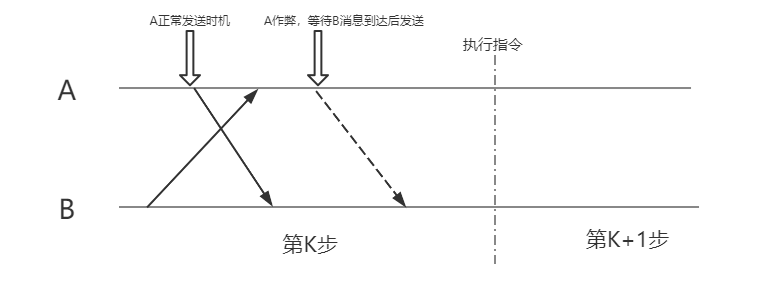 因此,在2001年,Nathaniel Baughman和Brian Neil Levine在IEEE上发表了论文,提出锁步同步协议 Lockstep protocol [8]来对抗lookahead cheat类型的外挂。这可能是第一次“Lockstep”一词被正式的用于游戏网络同步的描述中。不过要注意的是,这里的Lockstep protocol并不是我们前面提到的Deterministic Lockstep ,相比之前的在第K步(第K个Tick Command间隔)就直接发送第K+1步的明文操作信息,Lockstep protocol每一步都分两次发送信息。大概的流程如下: