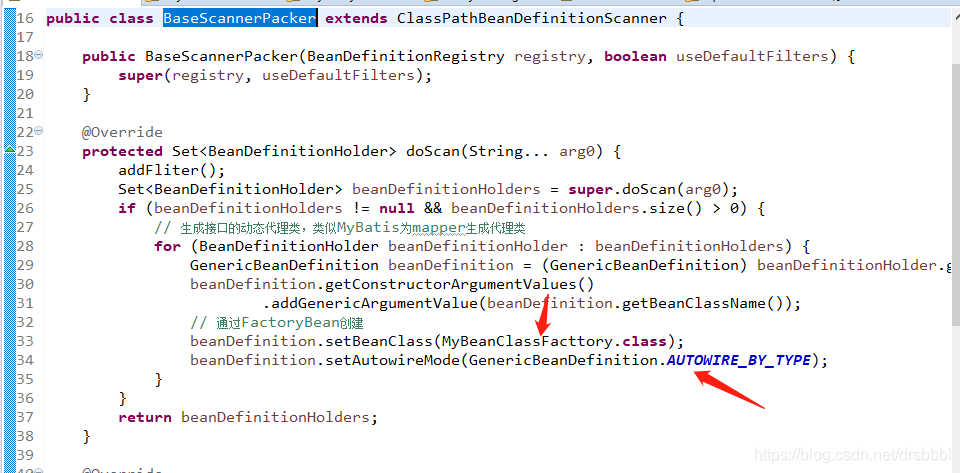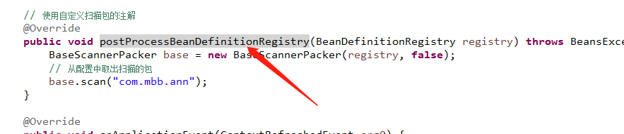实现 BeanDefinitionRegistryPostProcessor 接口。我们进行 扫描包的操作