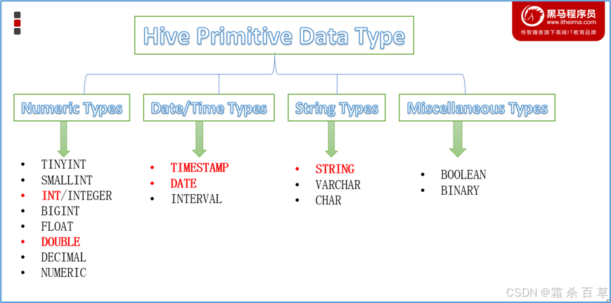 在实际应用中,最常使用的通常是INT、BIGINT、FLOAT、DOUBLE和STRING。