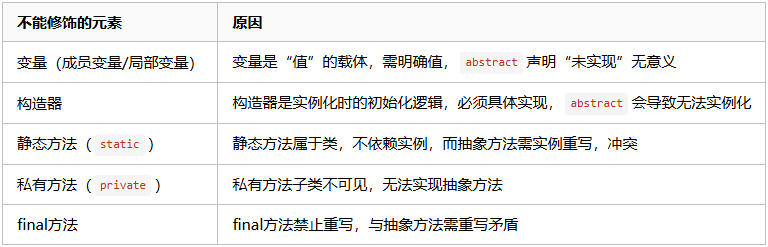 abstract并非万能,它有明确的修饰禁忌,需特别注意: