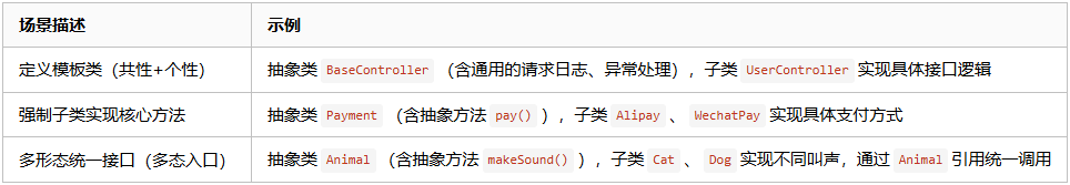方法抽象(修饰方法):定义“规范方法”,只有声明没有实现(无方法体),需子类重写提供具体逻辑。