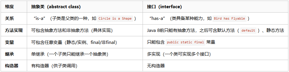 选择原则:若需定义“模板类”(包含共性实现+部分抽象方法),用抽象类;若需定义“能力规范”(纯抽象或多默认方法),用接口。