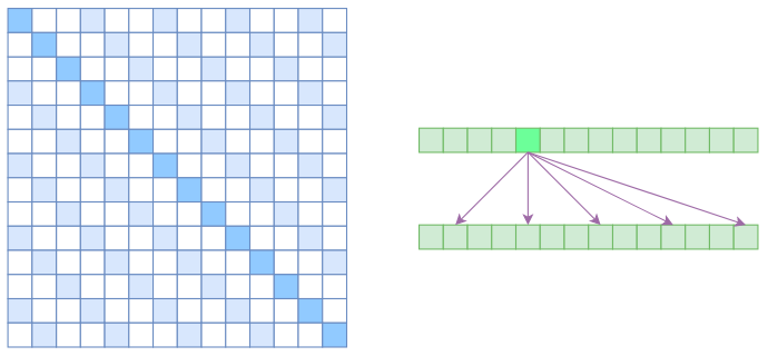 来看这张图,我们把空洞参数设置为 k,(k=3),所以实际上每个元素只跟 n/k 个元素算相关性。