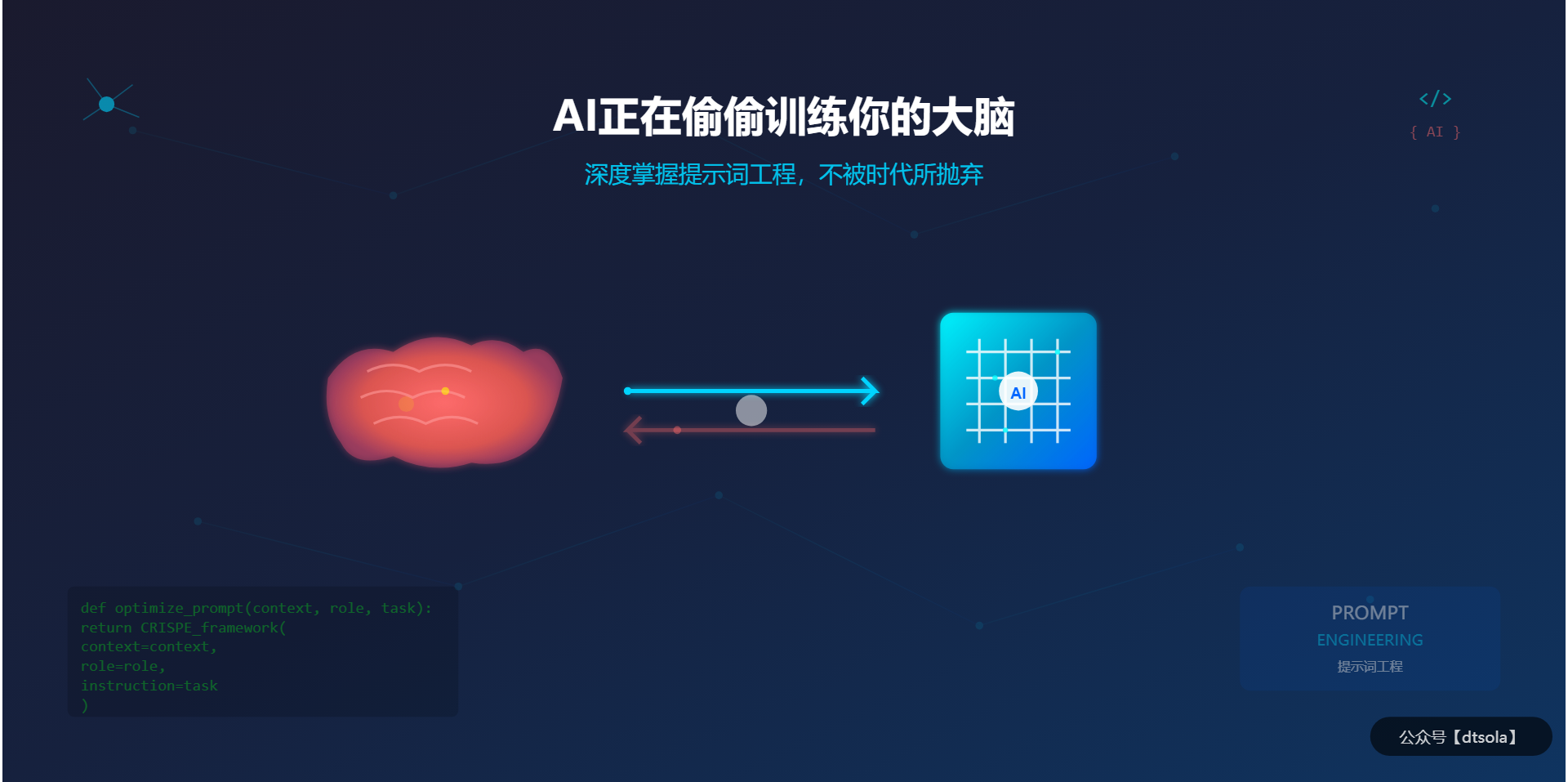 我是dtsola【IT解决方案架构师 | 一人公司实践者】,在过去几年与AI深度协作的过程中,我发现了一个令人深思的现象:那些真正掌握AI的人,往往不是技术最强的,而是最会"说话"的。他们懂得如何与AI对话,如何用精确的语言激发AI的最大潜能。今天,我想和大家分享这门被严重低估的核心技能——提示词工程,它正在成为AI时代最重要的生产力工具。